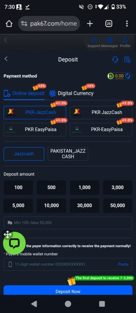 The Pak67 supports a variety of payment methods, including JazzCash, Easypaisa, and USDT. Moreover, this flexibility allows users to deposit and withdraw funds according to their preferences, ensuring a smooth and secure transaction experience.